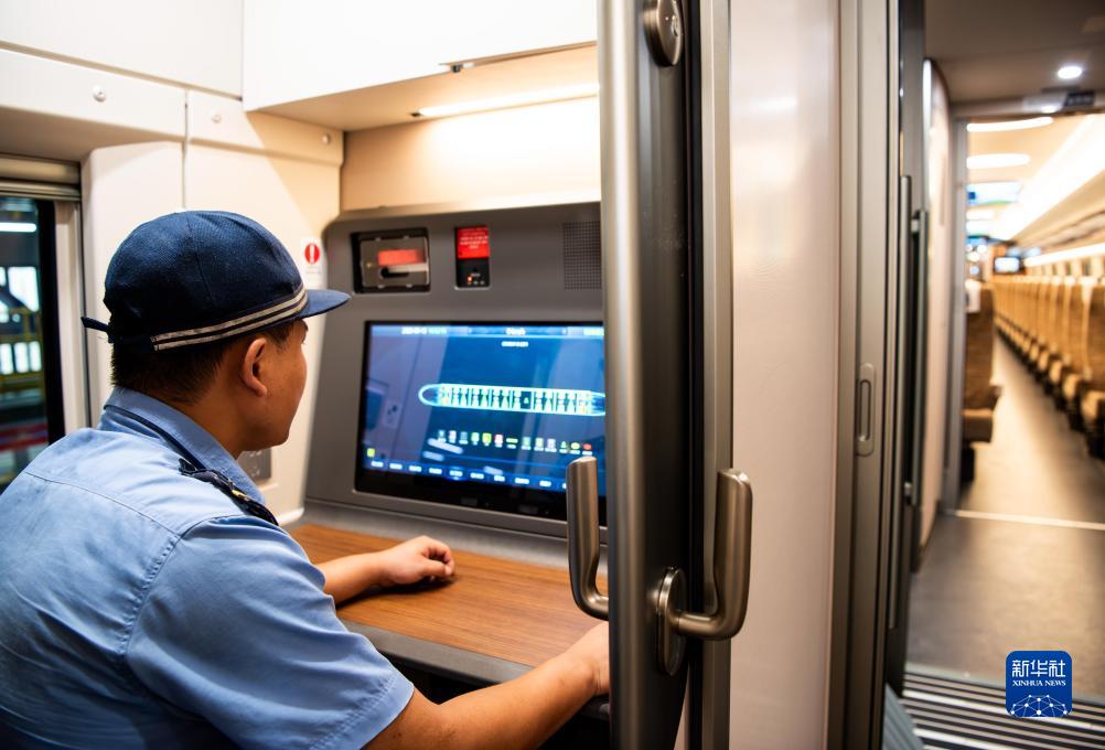 9月13日,在復興號智能配置動(dòng)車(chē)組車(chē)廂內,高春成對動(dòng)車(chē)組車(chē)廂進(jìn)行有電確認。