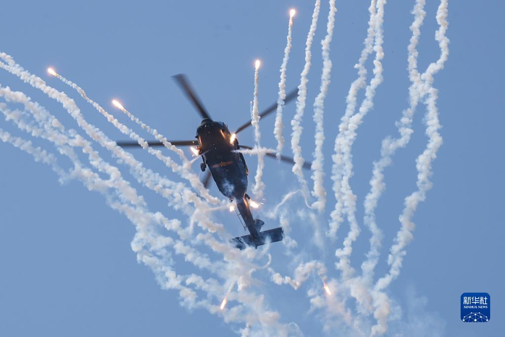 9月16日,陸軍“風(fēng)雷”飛行表演隊直-20戰術(shù)通用直升機發(fā)射干擾彈。