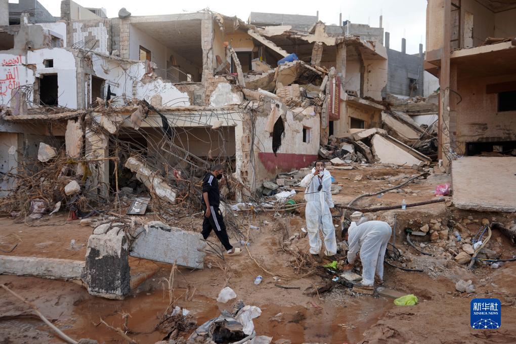 9月16日,救援人員在利比亞德?tīng)柤{的建筑廢墟旁工作。