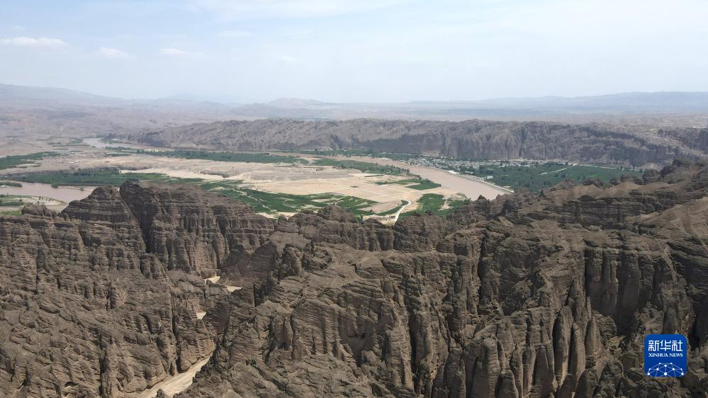這是黃河岸邊的甘肅省白銀市景泰縣中泉鎮龍灣村和黃河石林景觀(guān)(7月11日攝,無(wú)人機照片)。