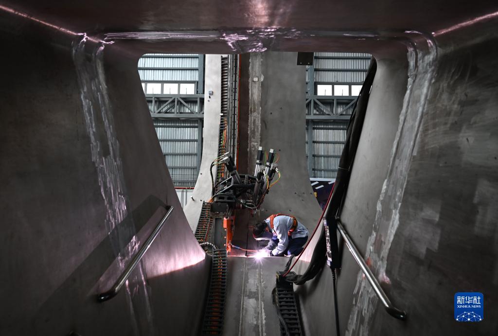 9月15日,工作人員在聚變堆主機關(guān)鍵系統綜合研究設施(CRAFT)1/8真空室及總體安裝實(shí)驗平臺進(jìn)行設備焊接。