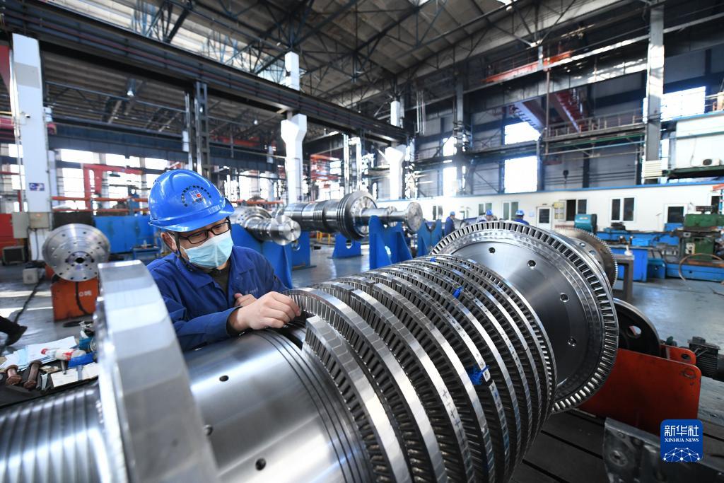 在哈電集團哈爾濱汽輪機廠(chǎng)有限責任公司的生產(chǎn)車(chē)間,工人在生產(chǎn)作業(yè)(2022年10月27日攝)。