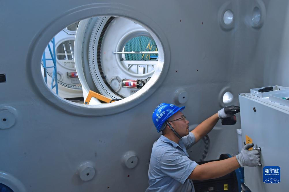 9月13日,中國船舶集團旗下中船海裝大連公司的裝配工在實(shí)施海上風(fēng)電機組輪轂控制柜的安裝工作。