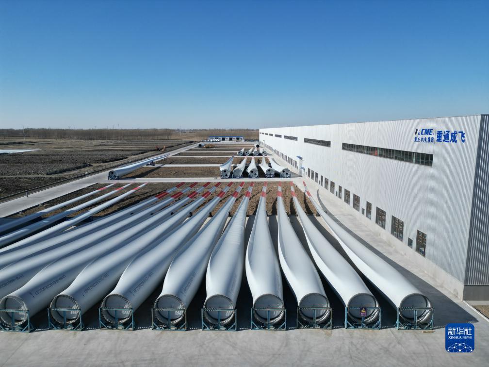 吉林重通成飛新材料股份公司大安公司生產(chǎn)的風(fēng)機葉片(2023年3月8日攝,無(wú)人機照片)。