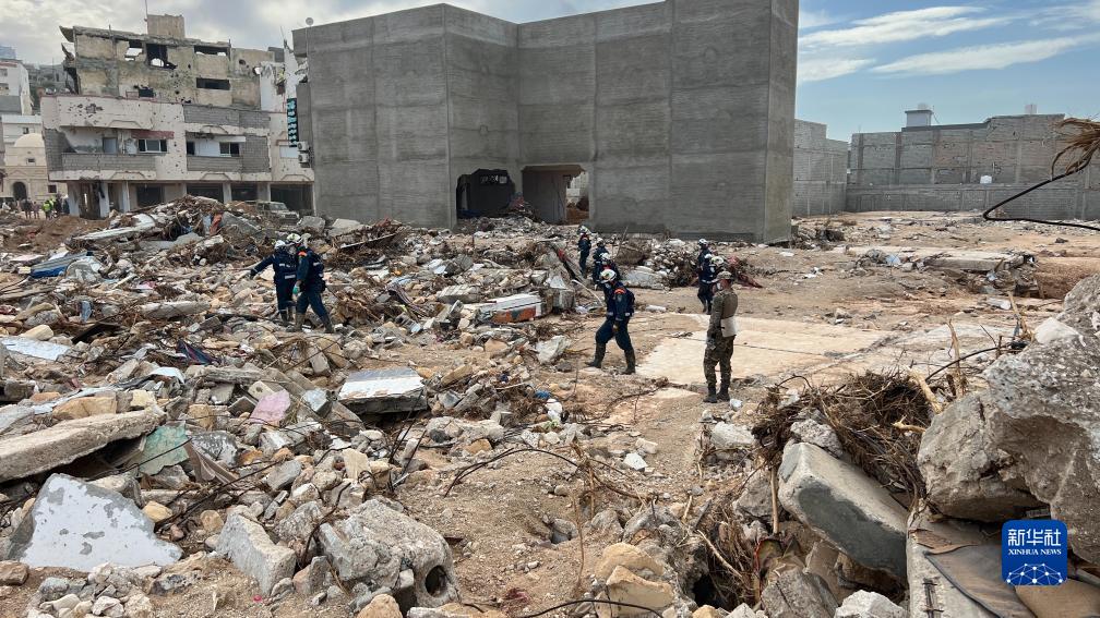 9月17日,國際救援人員在利比亞德?tīng)柤{的建筑廢墟上工作。