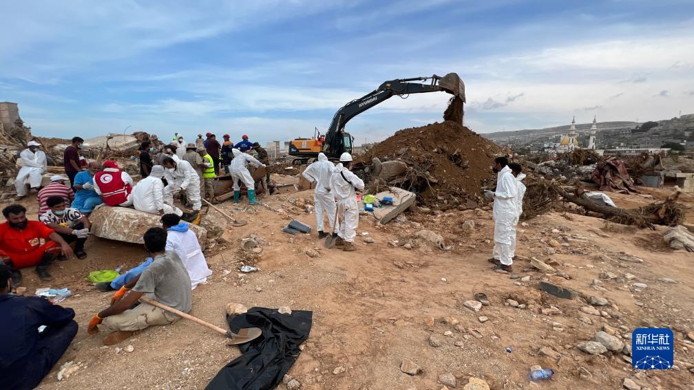 9月17日,救援人員在利比亞德?tīng)柤{的受災地區工作。