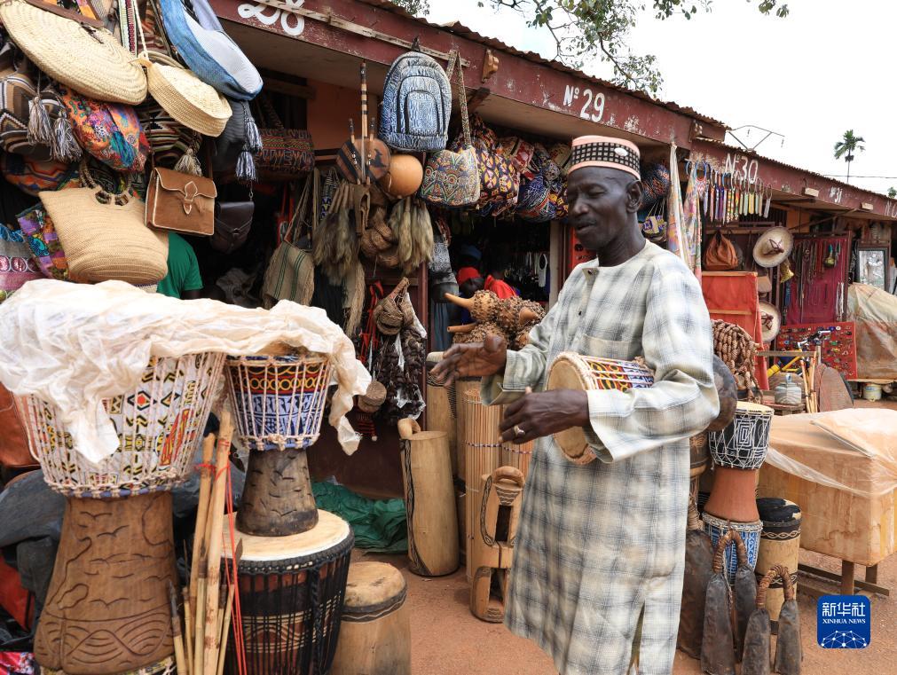 9月16日,在喀麥隆首都雅溫得手工藝品市場(chǎng),一名商販在推銷(xiāo)手鼓。