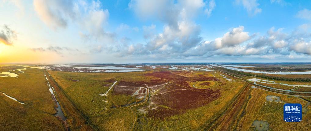 晨曦中的鹽城濕地珍禽國家級自然保護區景色(2022年11月8日攝,無(wú)人機照片)。