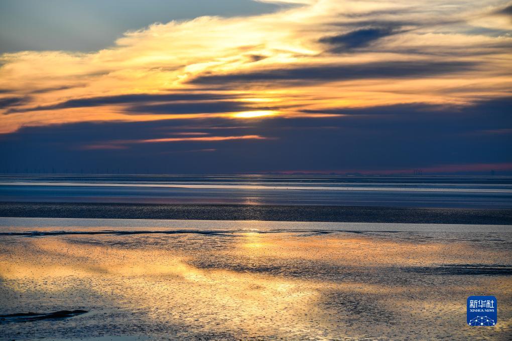 鹽城東臺條子泥濕地日出時(shí)分景色(2023年9月1日攝,無(wú)人機照片)。