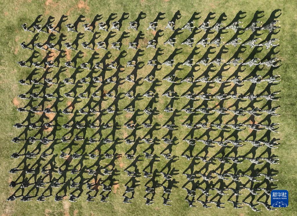 9月18日,在湖南衡陽(yáng),南華大學(xué)2023級新生在學(xué)校田徑運動(dòng)場(chǎng)進(jìn)行軍訓 (無(wú)人機照片)。