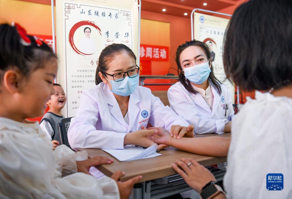 在新疆喀什市夏馬勒巴格鎮團結小區,來(lái)自山東中醫藥大學(xué)第二附屬醫院的援疆醫生李榮華(中)在面向社區居民的義診活動(dòng)中進(jìn)行義診(9月16日攝)。