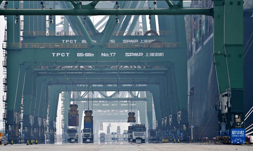 9月18日,卡車(chē)在天津港太平洋國際集裝箱碼頭運輸集裝箱。