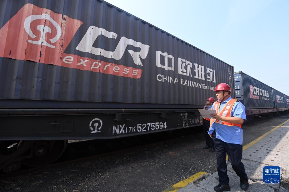 9月18日,在天津港物捷三堆場(chǎng),工作人員在檢查發(fā)運前的一列中歐(中亞)班列。