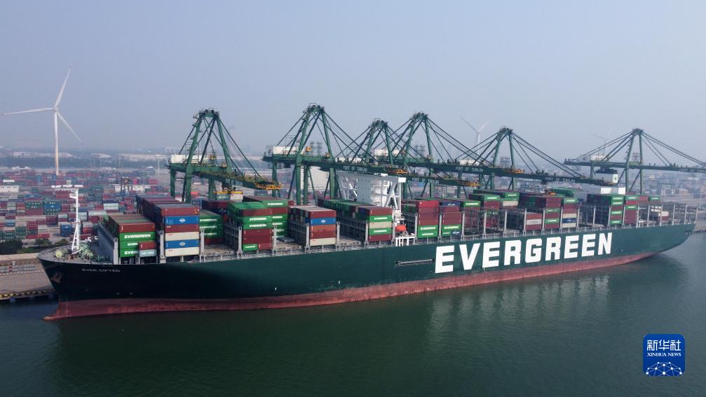9月18日,一艘貨輪在天津港太平洋國際集裝箱碼頭進(jìn)行裝卸作業(yè)(無(wú)人機照片)。