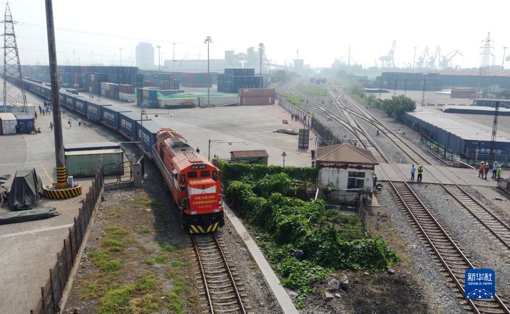 9月18日,一列發(fā)往蒙古國烏蘭巴托的中歐(中亞)班列駛出天津港物捷三堆場(chǎng)(無(wú)人機照片)。