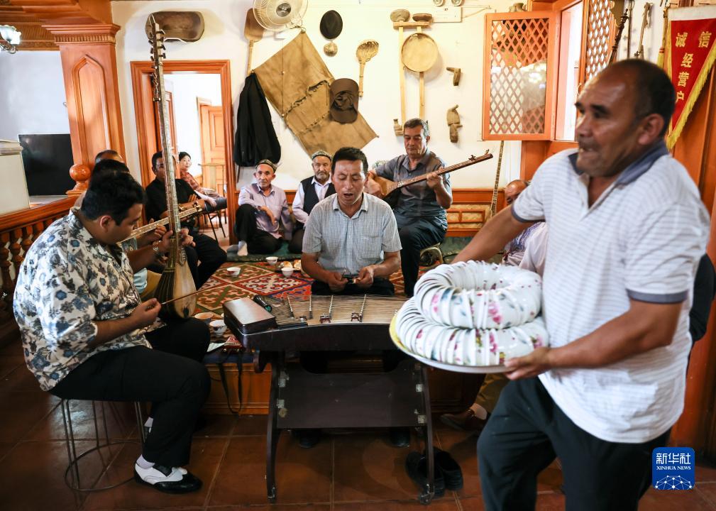 樂(lè )手在新疆喀什古城百年老茶館內彈唱(9月7日攝)。