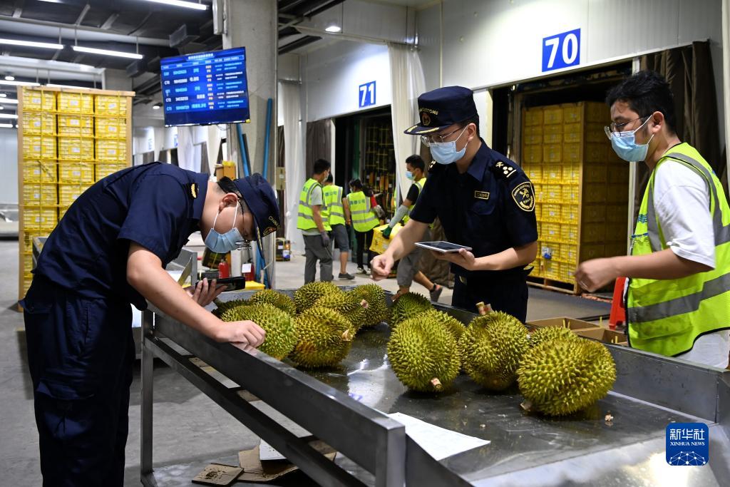 9月12日,在廣西憑祥友誼關(guān)口岸,海關(guān)工作人員對進(jìn)口的榴蓮進(jìn)行查驗。