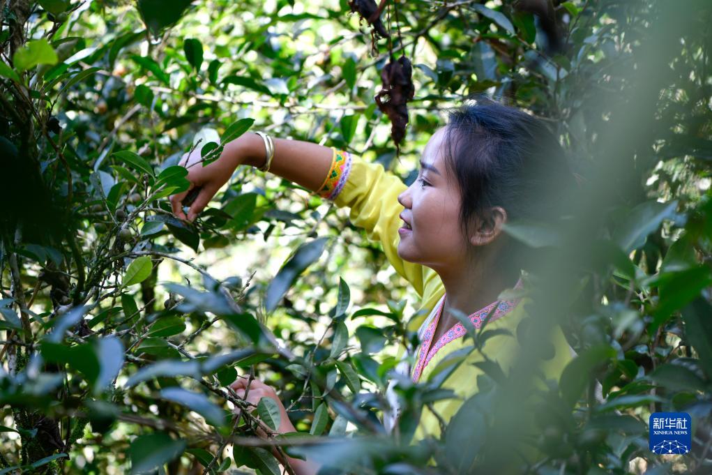 9月19日,景邁山翁基古寨的布朗族茶農玉炳在古茶林里采摘秋茶。