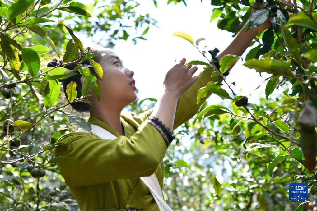 9月19日,景邁山翁基古寨的布朗族茶農玉勐在古茶林里采摘秋茶。