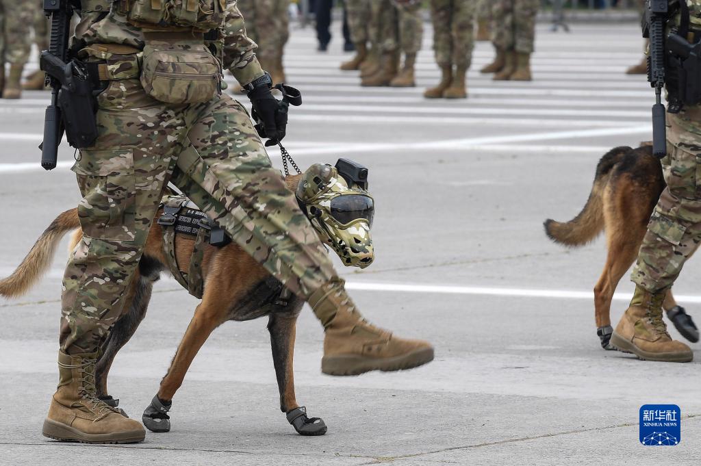9月19日,在智利首都圣地亞哥,士兵攜帶軍犬參加閱兵式。