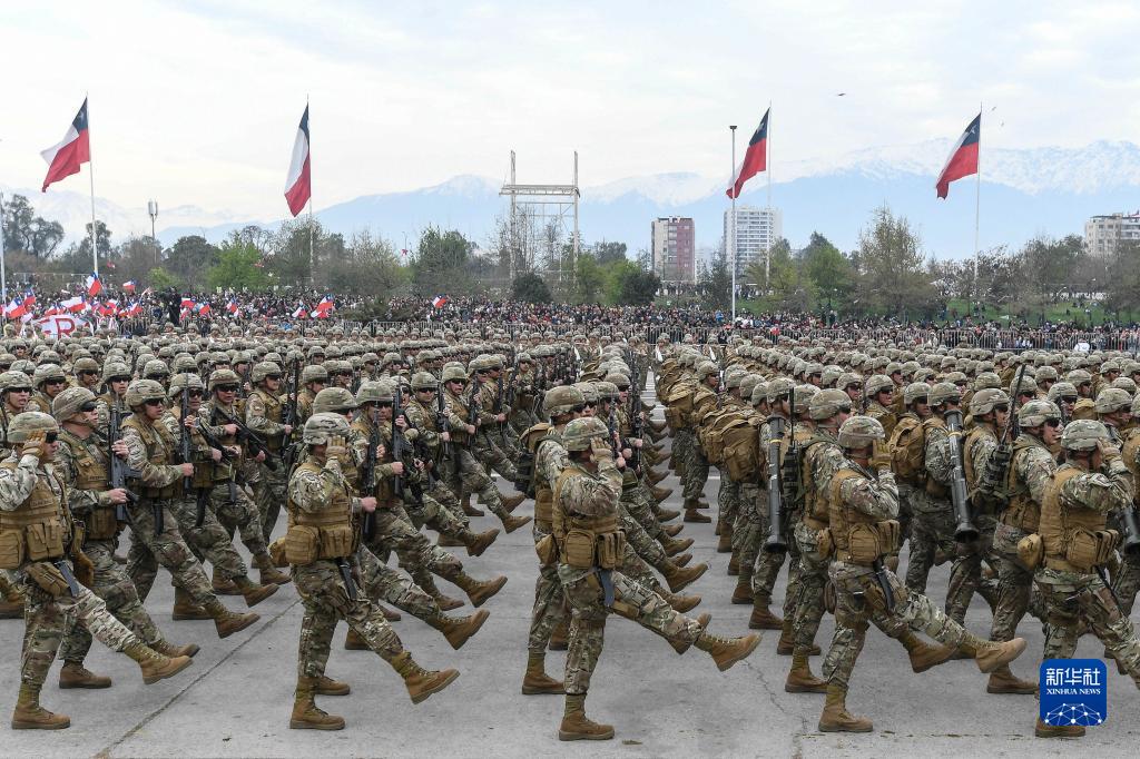 當日,一年一度的智利陸軍節閱兵式在首都圣地亞哥奧伊金斯公園舉行。智利陸??杖姾途觳筷?700多人參加了閱兵式。