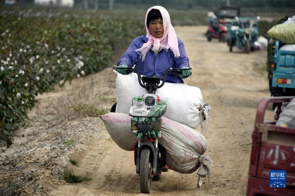 9月19日,山東省無(wú)棣縣西小王鎮棉農在運送采收的新棉。