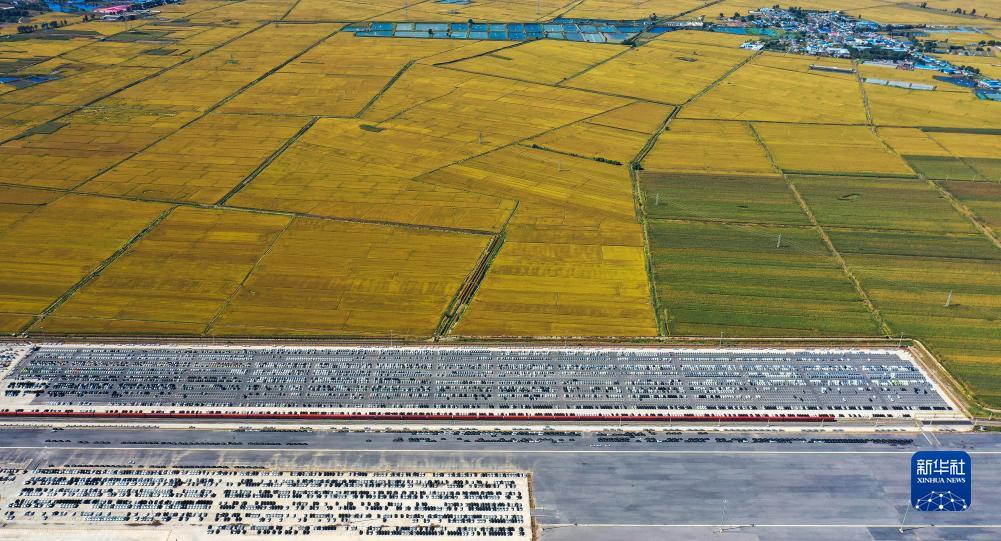 中歐班列(沈陽(yáng))集結中心停滿(mǎn)待發(fā)運車(chē)輛的停車(chē)場(chǎng)與周邊的農田景色(無(wú)人機照片,9月19日攝)。
