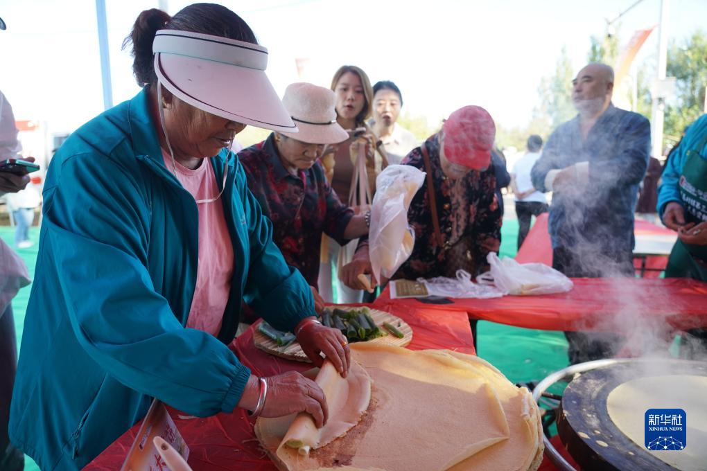 9月20日,在北京市平谷區東高村鎮趙家務(wù)村大蔥種植基地,市民在活動(dòng)現場(chǎng)品嘗煎餅卷大蔥。
