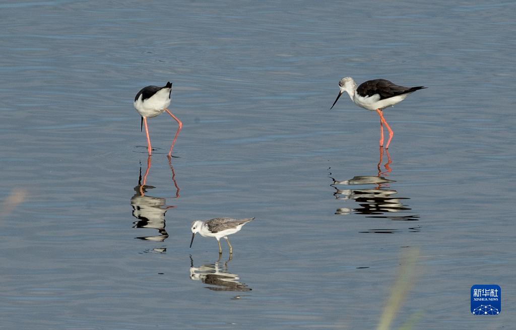 鳥(niǎo)兒在東臺條子泥濕地覓食(8月20日攝)。