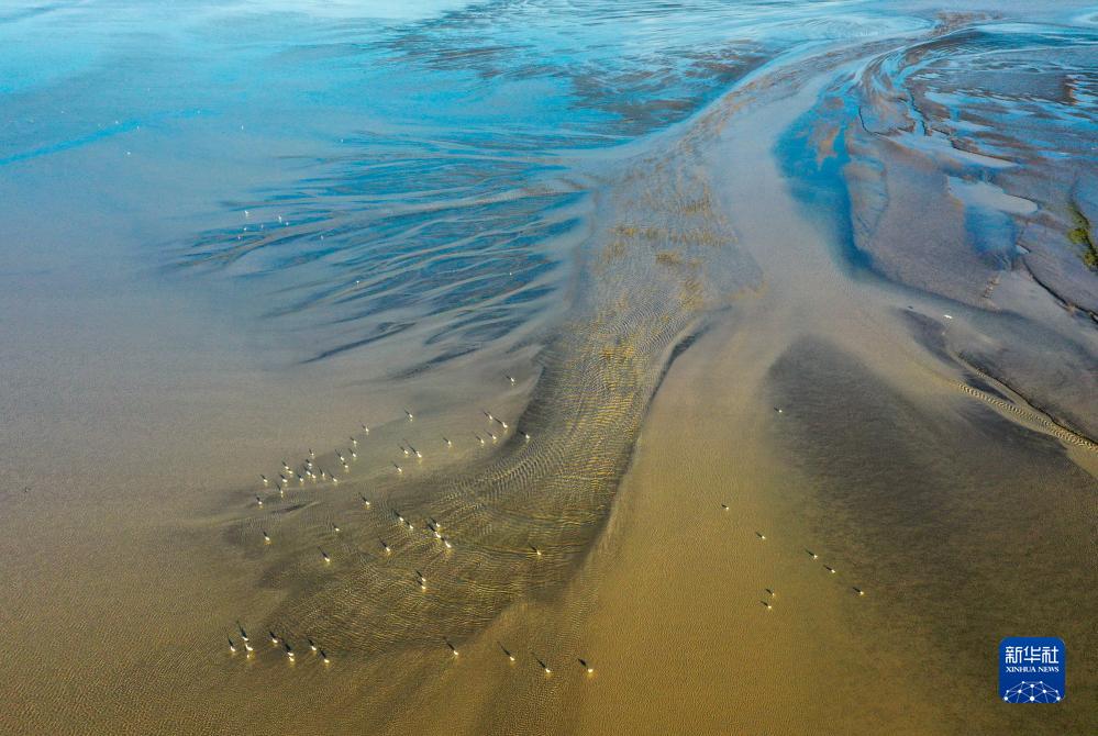 白鷺棲息在夕陽(yáng)下東臺條子泥濕地(9月1日攝,無(wú)人機照片)。