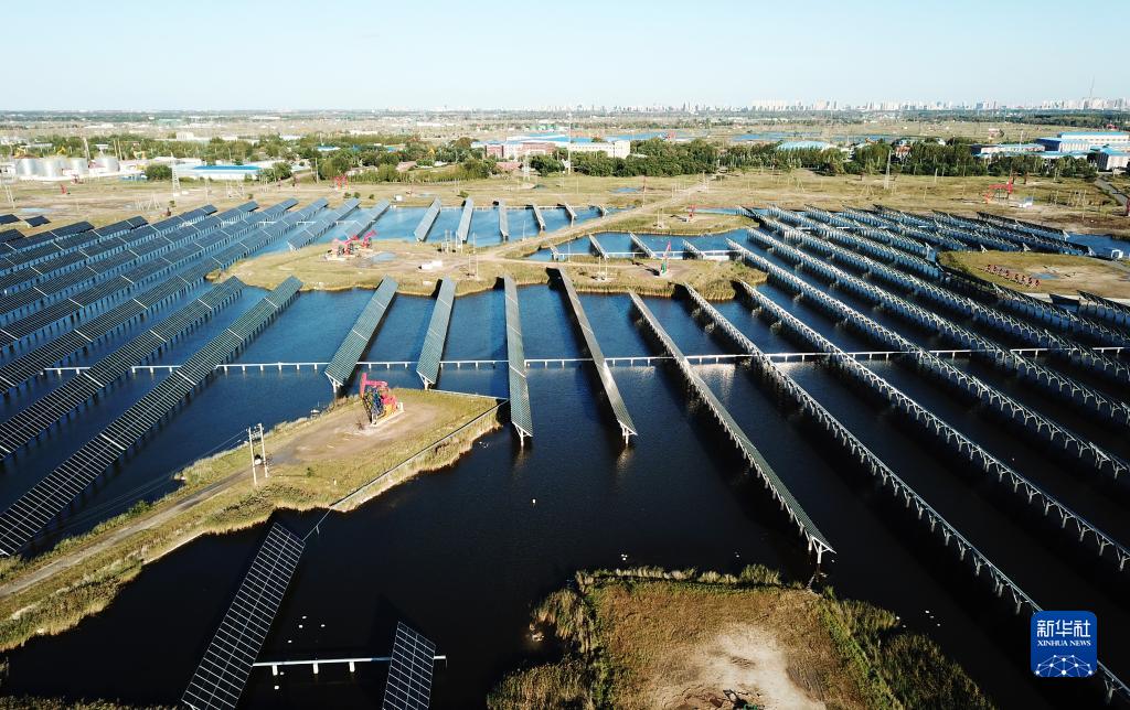 這是9月19日拍攝的大慶油田星火水面光伏電站局部(無(wú)人機照片)。