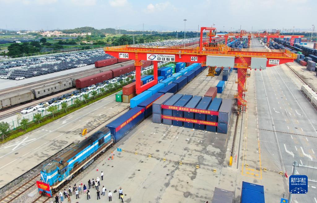 9月20日,50英尺集裝箱多聯(lián)快車(chē)X802次貨運列車(chē)從廣州國際港駛出,一路北上向著(zhù)長(cháng)沙而行(無(wú)人機照片)。