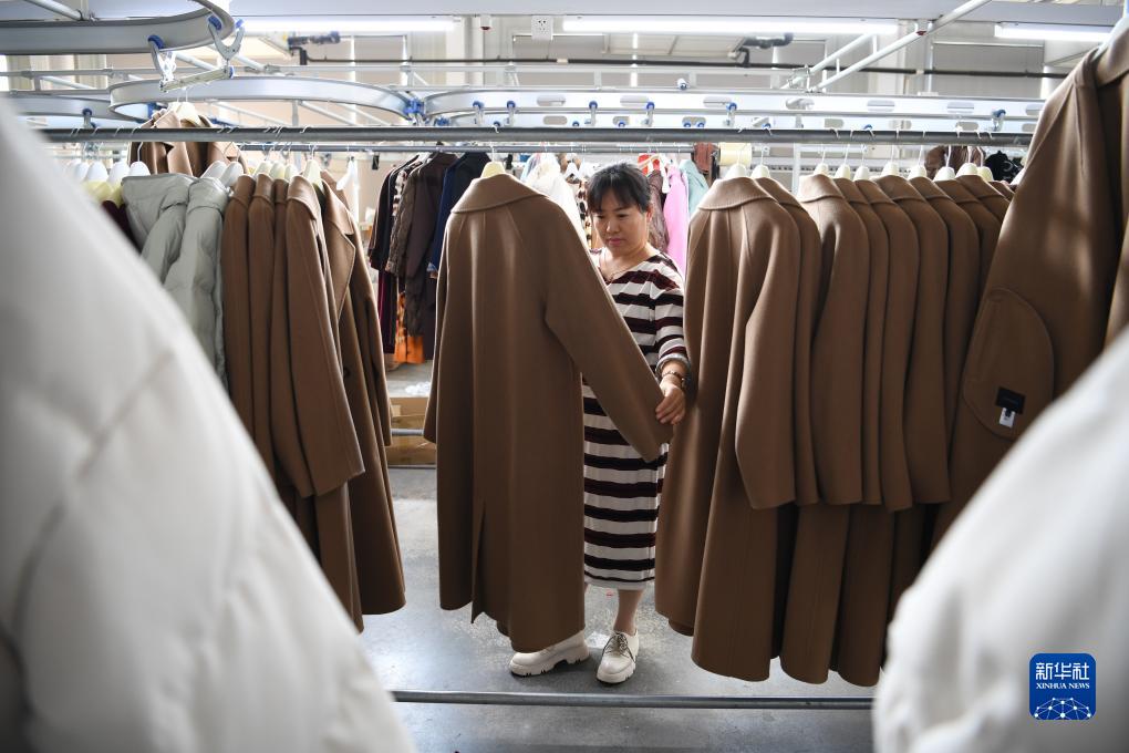 9月20日,在位于南宮市的河北鴻熙服裝股份有限公司,工人在檢查服裝產(chǎn)品質(zhì)量。
