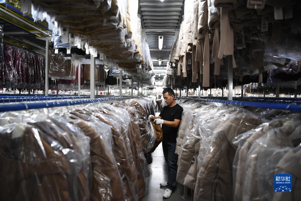 9月20日,在位于南宮市的河北鴻熙服裝股份有限公司,工人在庫房?jì)日矸b產(chǎn)品。