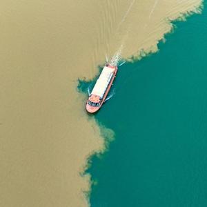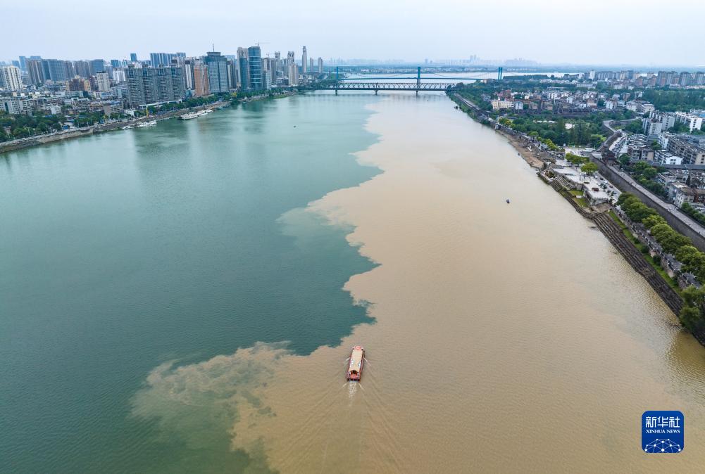 9月20日,受降雨影響,漢江湖北襄陽(yáng)城區段呈現出“涇渭分明”的景觀(guān)(無(wú)人機照片)。