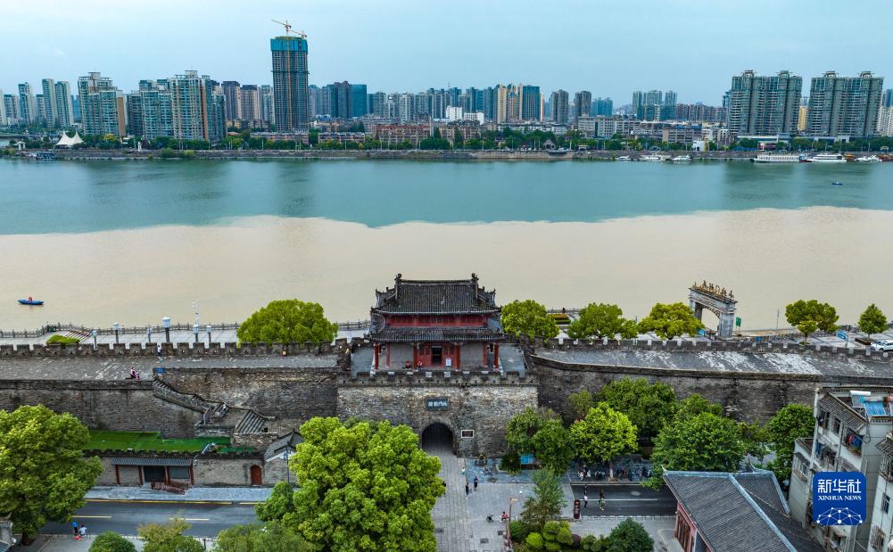 9月20日,受降雨影響,漢江湖北襄陽(yáng)城區段呈現出“涇渭分明”的景觀(guān)(無(wú)人機照片)。