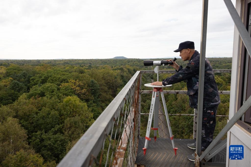 長(cháng)白山國家級自然保護區,瞭望員王孝華正在瞭望臺上值守(9月16日攝)。進(jìn)入森林防火期后,他天一亮就登上瞭望臺觀(guān)測,直至天黑才下臺休息。
