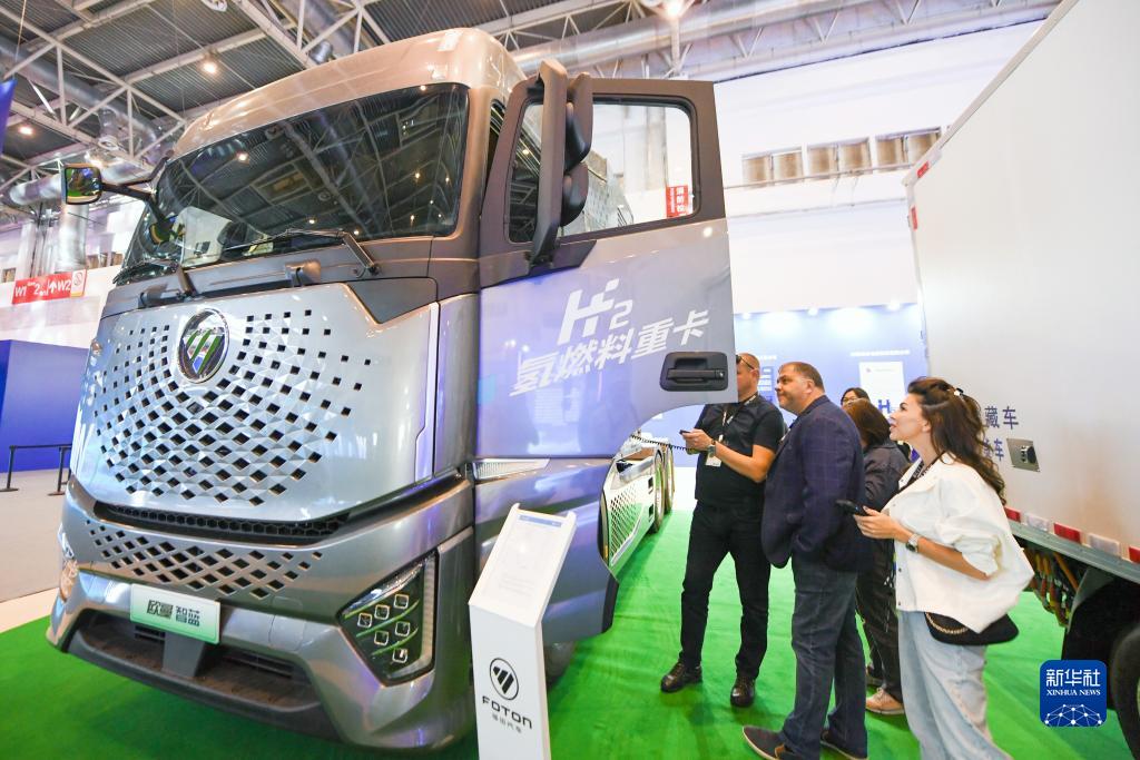 9月21日,在2023世界智能網(wǎng)聯(lián)汽車(chē)大會(huì )室內展區,幾位國外參觀(guān)者在參觀(guān)一輛氫燃料重卡。