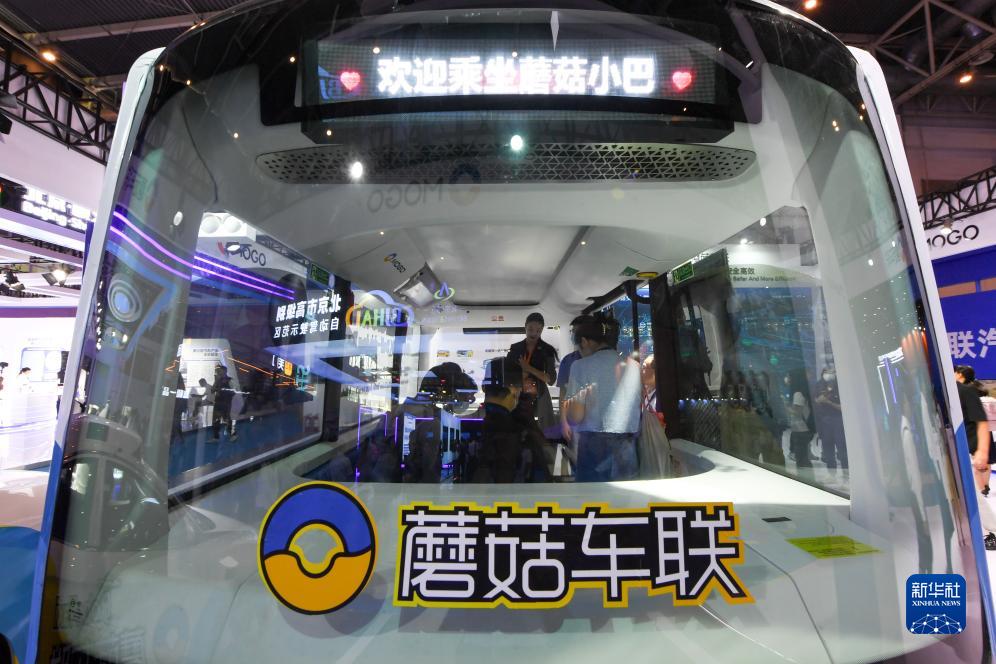 9月21日,在2023世界智能網(wǎng)聯(lián)汽車(chē)大會(huì )室內展區,參觀(guān)者在參觀(guān)一輛無(wú)人駕駛小巴車(chē)。