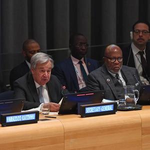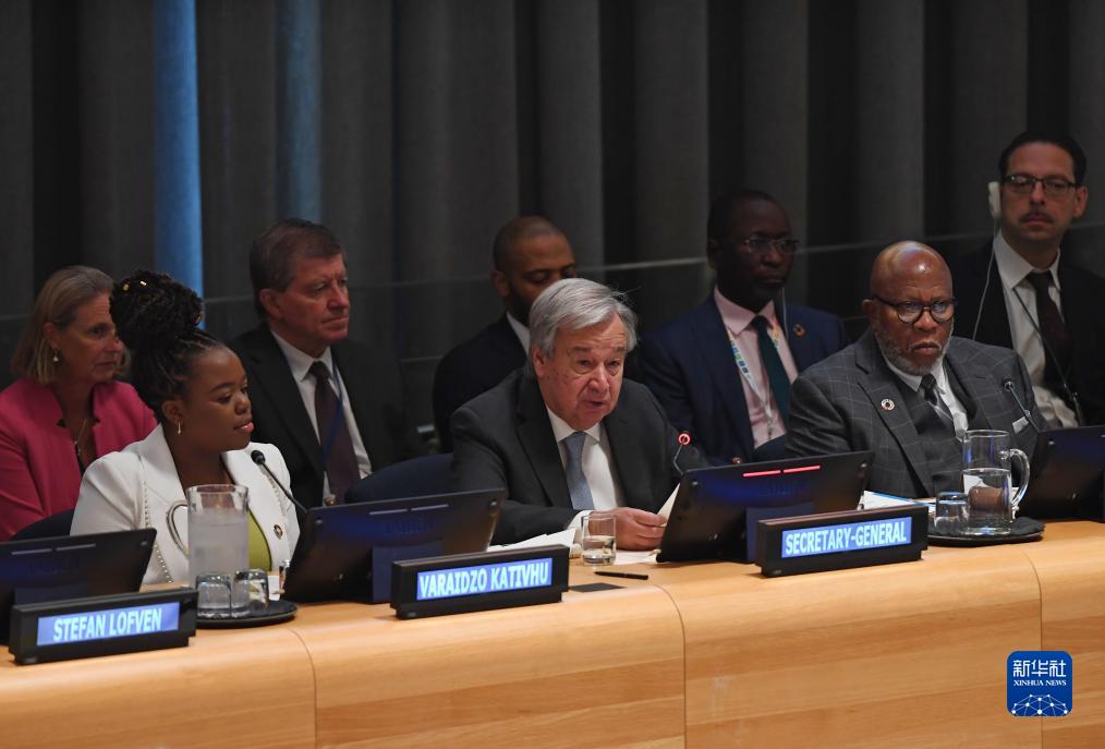 9月21日,在位于紐約的聯(lián)合國總部,聯(lián)合國秘書(shū)長(cháng)古特雷斯(前中)在未來(lái)峰會(huì )部長(cháng)級籌備會(huì )上講話(huà)。