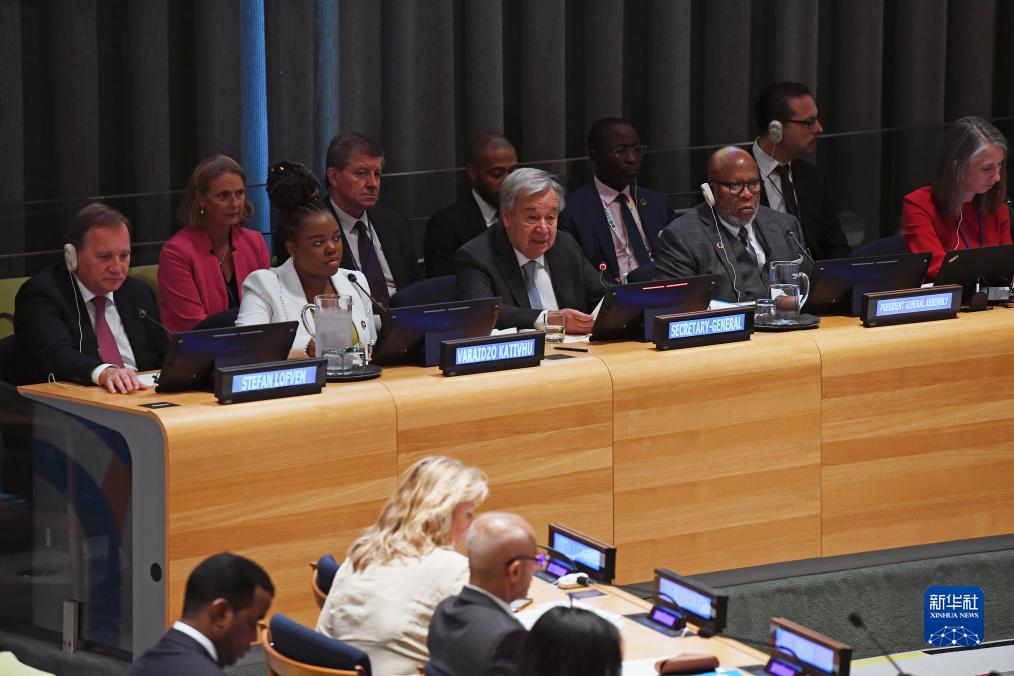 9月21日,在位于紐約的聯(lián)合國總部,聯(lián)合國秘書(shū)長(cháng)古特雷斯(中)在未來(lái)峰會(huì )部長(cháng)級籌備會(huì )上講話(huà)。