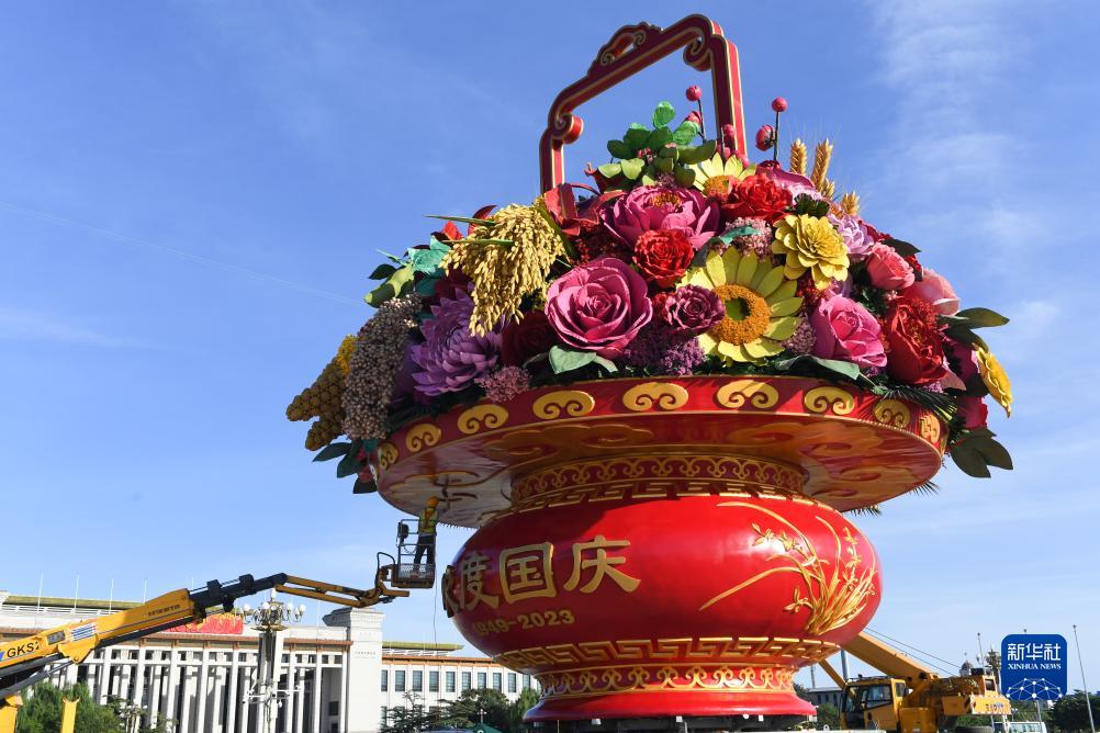 9月22日,施工人員在裝飾天安門(mén)廣場(chǎng)上的“祝福祖國”巨型花籃。