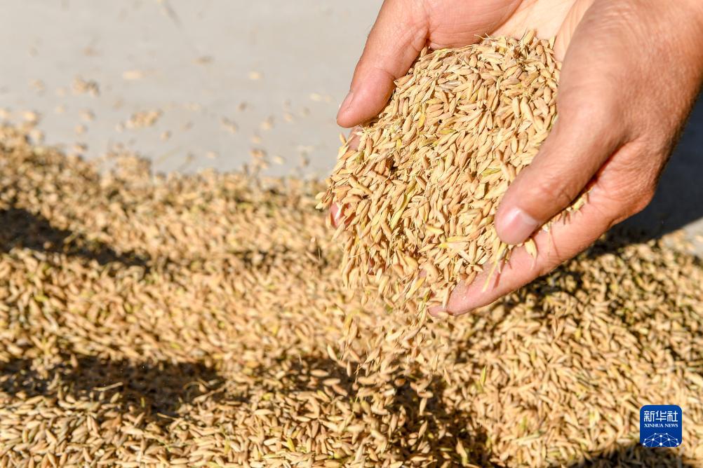 9月22日,在吉林省長(cháng)春市九臺區龍嘉農樂(lè )種植家庭農場(chǎng),負責人李松在手捧收獲的稻谷。