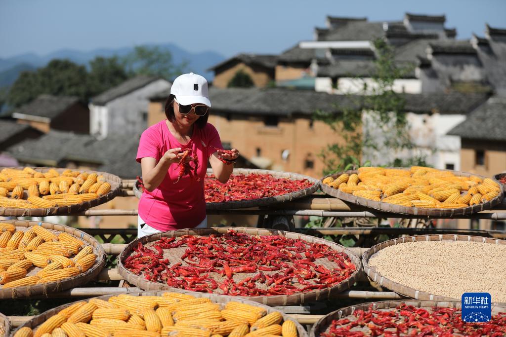 金秋時(shí)節,在安徽省黃山市徽州區呈坎村及黃山市歙縣深渡鎮陽(yáng)產(chǎn)村,“曬秋”成為秋天里一道靚麗的風(fēng)景?!皶袂铩笔峭钅系貐^的傳統習俗,由于氣候潮濕,當地村民利用晴好天氣,將收獲的農作物集中晾曬。五顏六色的農作物被拼成精美的圖案,慶祝豐收的同時(shí),也成為當地特色景觀(guān),吸引不少游客前來(lái)觀(guān)賞。