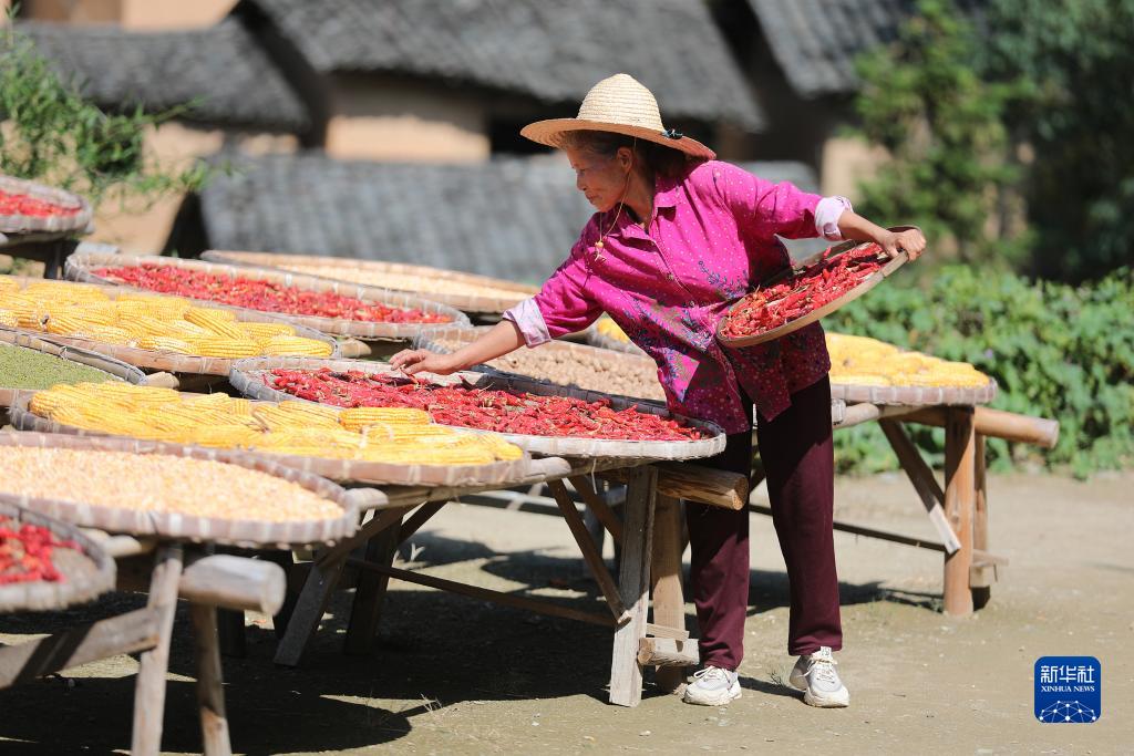 9月18日,在黃山市歙縣陽(yáng)產(chǎn)村,村民在曬場(chǎng)上晾曬農作物。