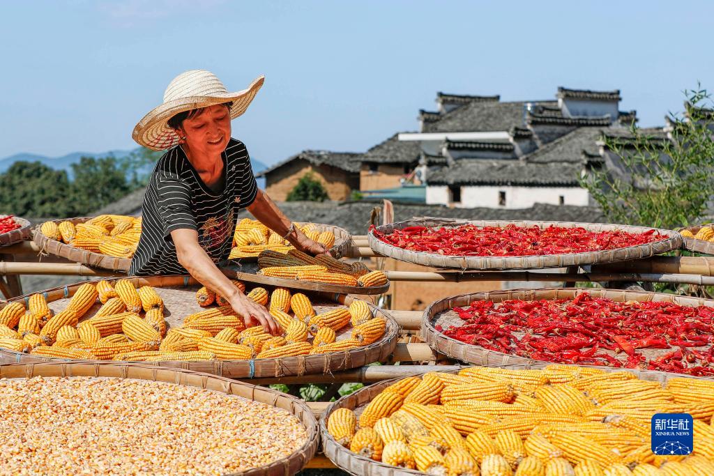9月18日,在黃山市歙縣陽(yáng)產(chǎn)村,村民在曬場(chǎng)上晾曬農作物。