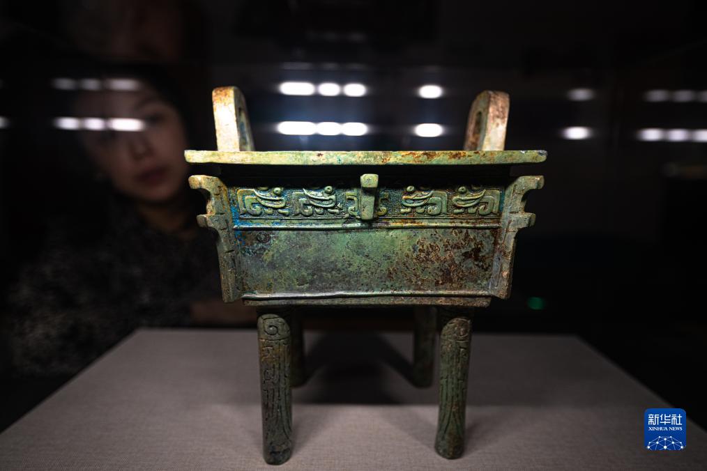 9月23日,參觀(guān)者在湖北省博物館長(cháng)江文明特展上觀(guān)看展出的曾侯諫銅方鼎。