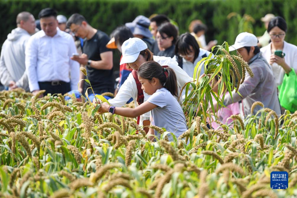 9月23日,一位家長(cháng)帶著(zhù)小朋友在北京先農壇耤田內體驗收割稷。