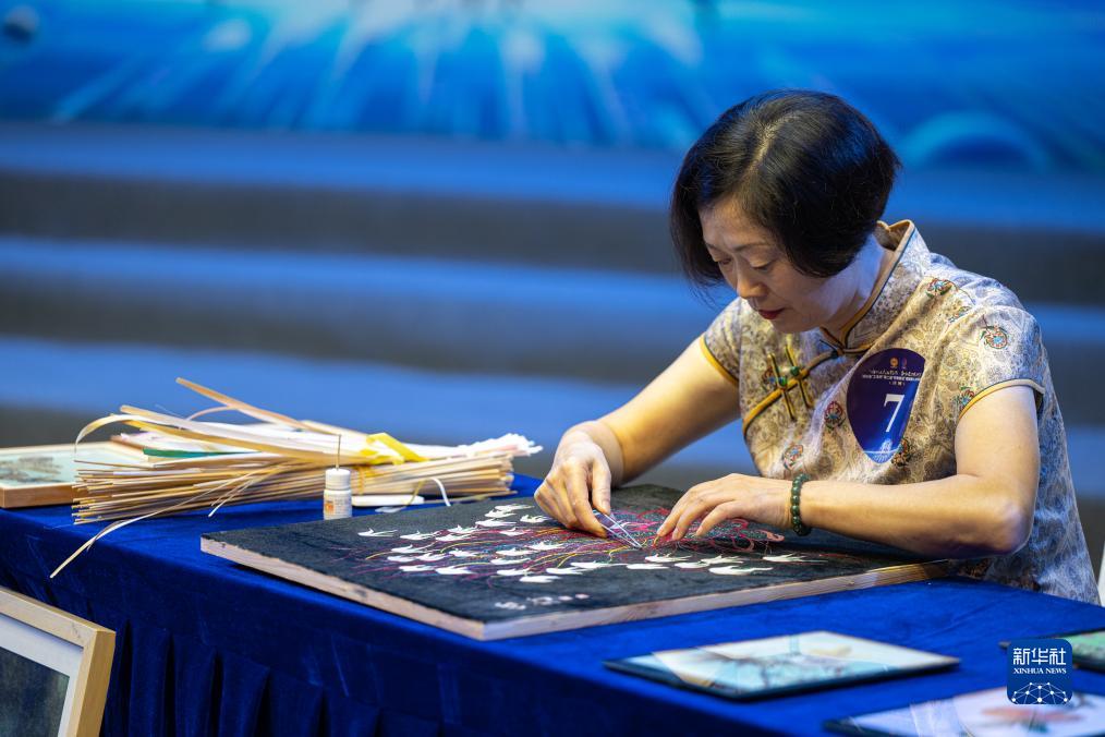 9月21日,選手劉榮萍在現場(chǎng)展示民間美術(shù)麥稈畫(huà)技藝。