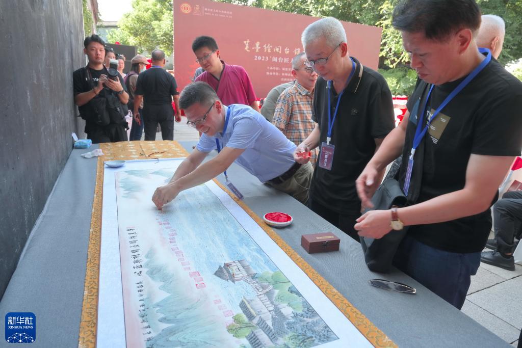 9月23日,海峽兩岸的匠人們用自己的筆墨和印章,共同完成“匠心連兩岸”書(shū)畫(huà)作品。這是匠人以印痕組成一道跨越兩岸虹橋的情景。